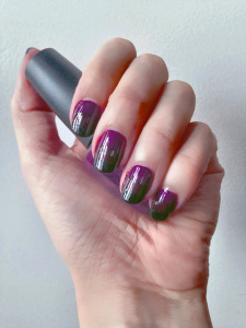 This ombré nail look was my next attempt at ombré, and I tried for a bit more subtle a look, as well as a more complicated process. I actually sponged on two colors, creating a smoother transition from my purple base to black. The base color was Opi’s “Louvre Me, Louvre Me Not,” the second color was Opi’s “We’ll Always Have Paris,” and the third color was Essie’s “Licorice.” One unexpected perk I found to the ombré nail art, is that it is extremely durable. I’m tough on my nails, manicures usually only last a day or two, but these nails lasted a little over a week. That makes me a fan!