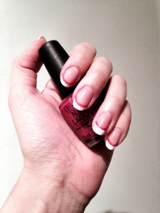 French manicures are a staple in my nail art pocket. I did these girlie French nails while I was on the phone with my mother (can you say multi-tasker). I started with a traditional French manicure using Essie’s “Blanc” for the tips. Then using a nail brush I added a line of Opi’s “Pompeii Purple” underneath. I finished off with a coat of Essie’s “Sugar Daddy”.